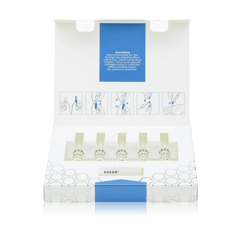 Käyttö: Ampulli avataan varovasti mukana tulevalla ampullinavaajalla. Ampullin sisältö levitetään kasvoille ja annetaan imeytyä 2-5 min ajan. Vain ulkoiseen käyttöön.