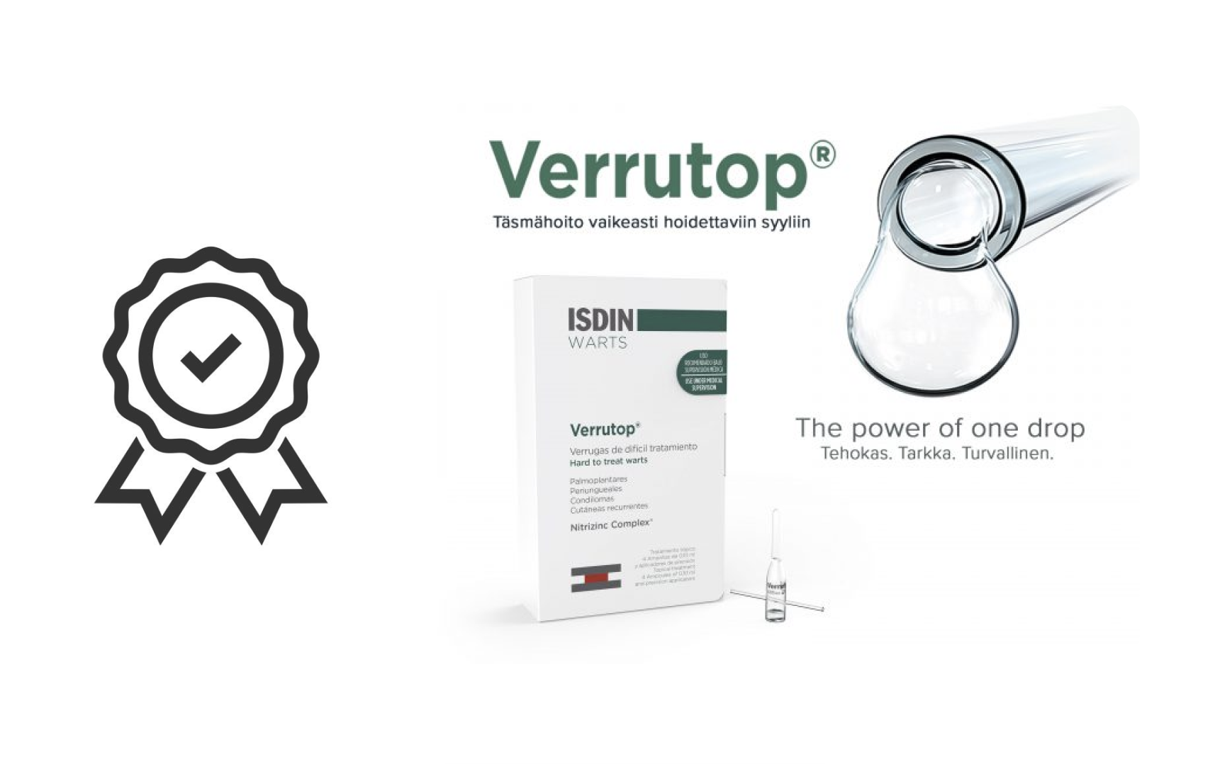 Verrutop on tehokas, tarkka ja turvallinen syylänhoitomenetelmä ammattilaiskäyttöön. Tuote on hyvin siedetty, ulkoiseen käyttöön tarkoitettu syylienhoitoliuos. Vaikutustapa perustuu kemialliseen reaktioon syylässä. Verrutop on helppo ja yksinkertainen käyttää. Tuote säilyy huoneenlämmössä, mahtuu pieneen tilaan ja voidaan ottaa kätevästi mukaan kotikäynneille!
